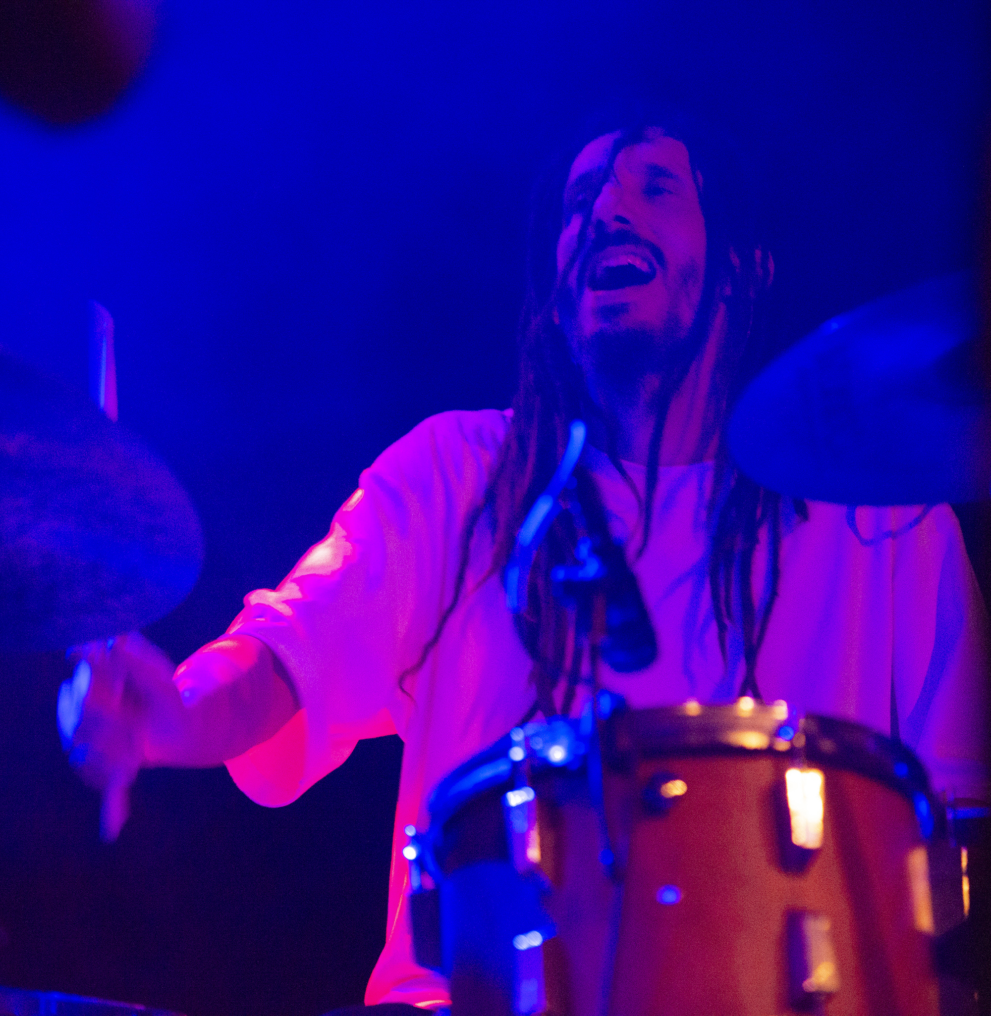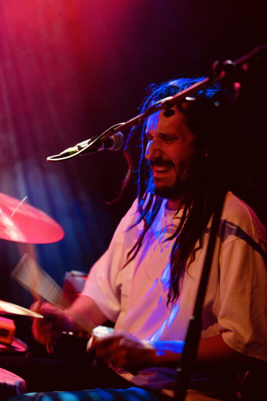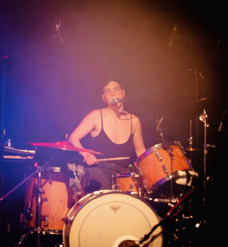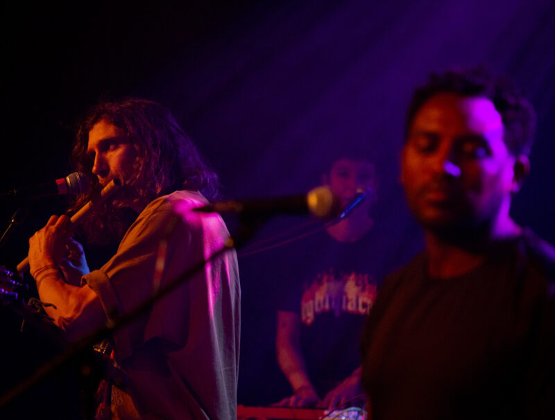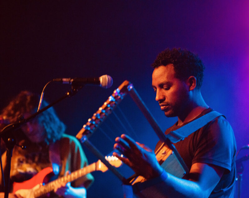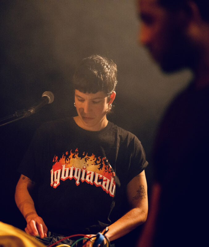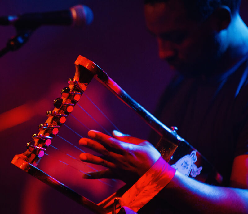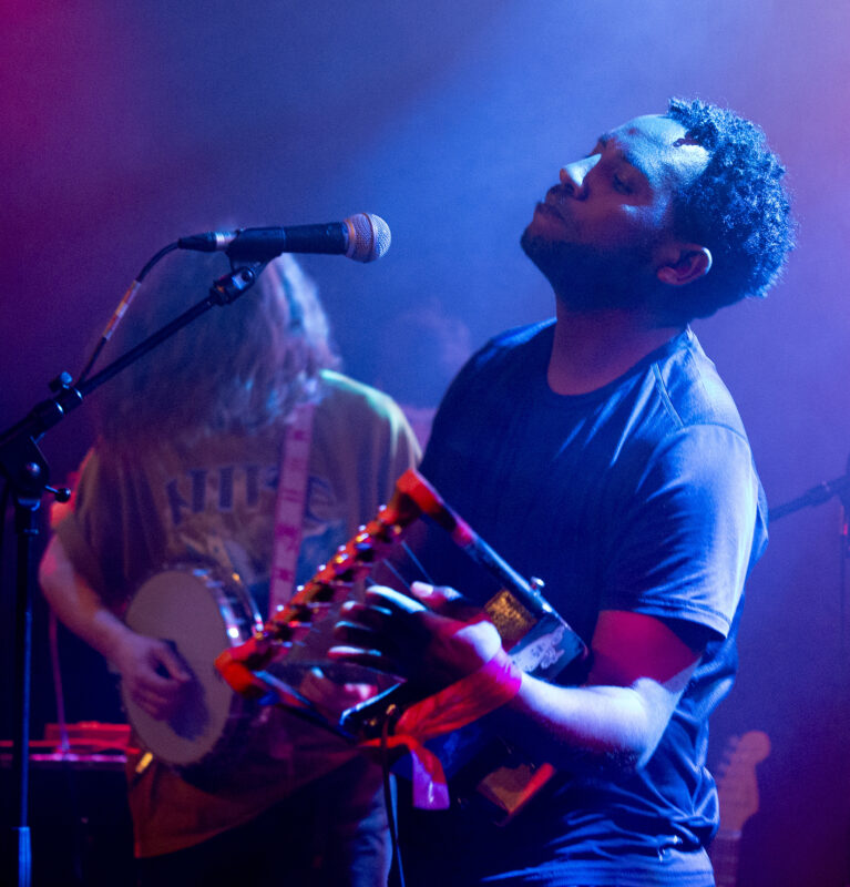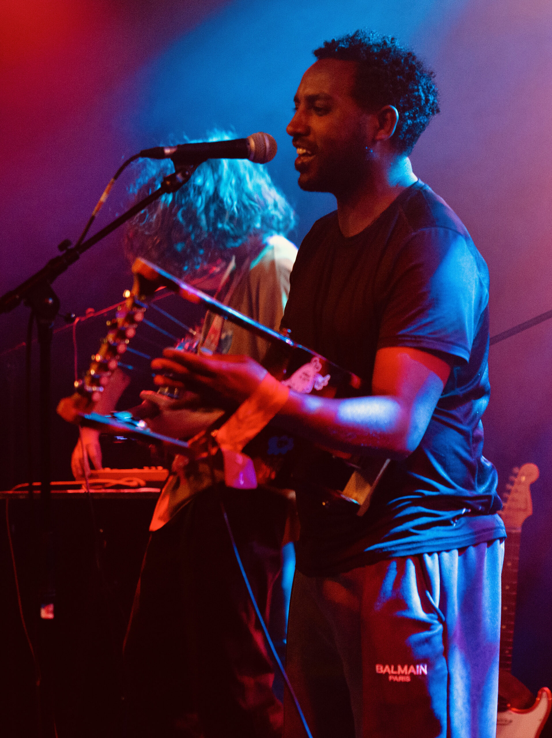 On les a déjà vu·es/entendue·s au festival Forest Sounds. Mais sur la petite scène du BRASS, c’est encore autre chose. Au centre de la scène : Sam et son krar, une lyre à cordes  qu’on trouve en Érythrée et en Éthiopie. Là il chante en afar, une langue parlée par des nomades dans ces 2 pays. Les autres (les 2 Cyril, Louise et Emma) chantent aussi ! Le syncrétisme explosif de ce velvète underground emmène la salle dans une espèce de transe, entre banjo modifié, électronique brute et t-shirt lgbtqiacab.