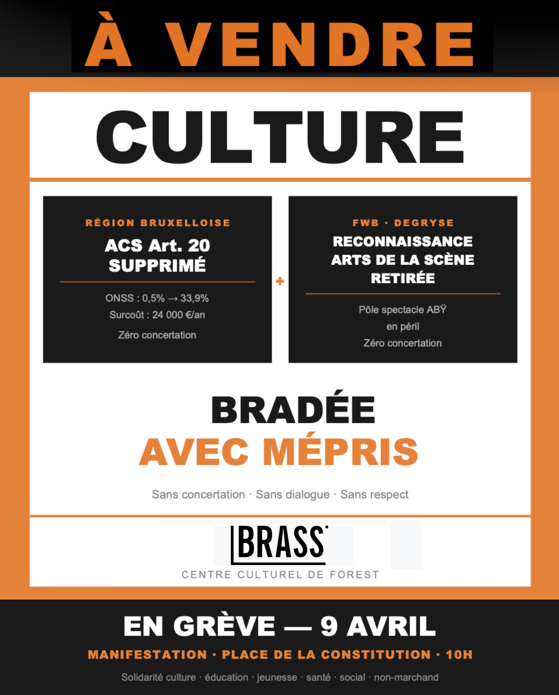 Le BRASS en grève le 9 avril contre l’étranglement de la culture, du non-marchand et de tous les secteurs fragilisés.