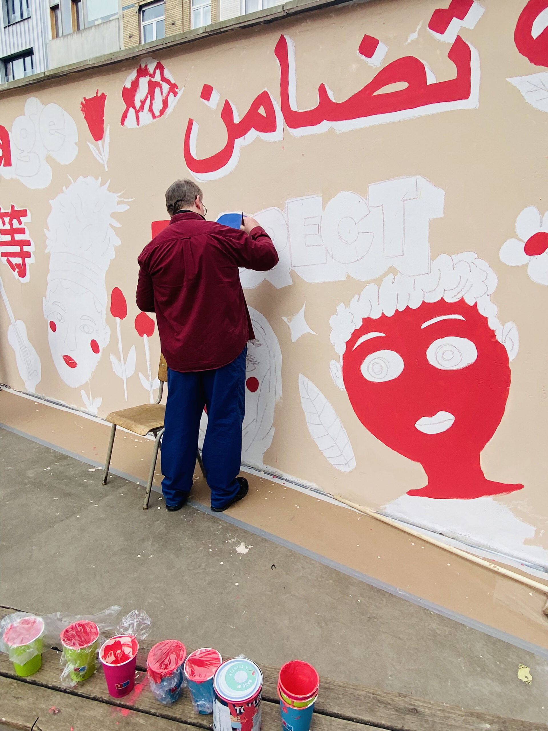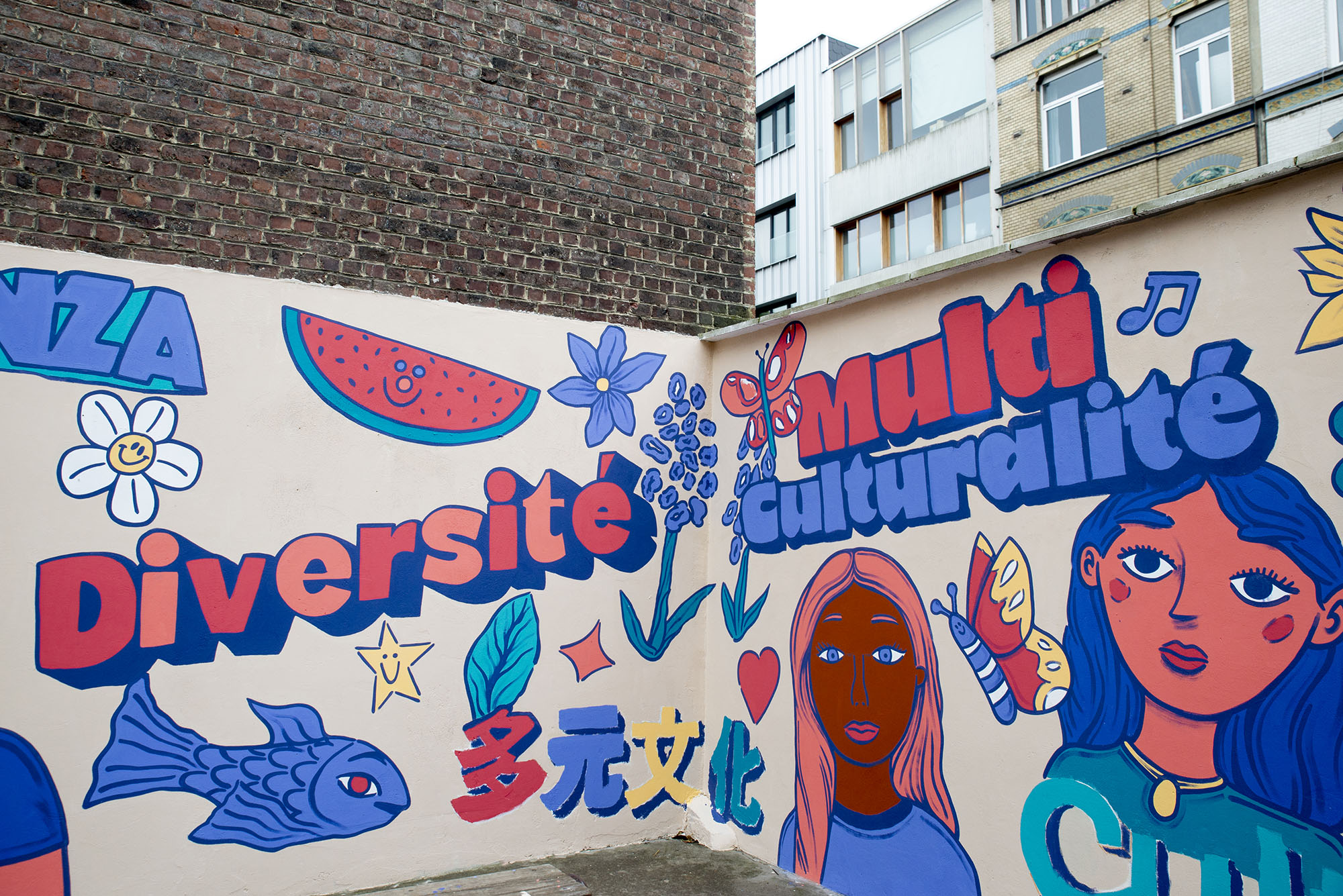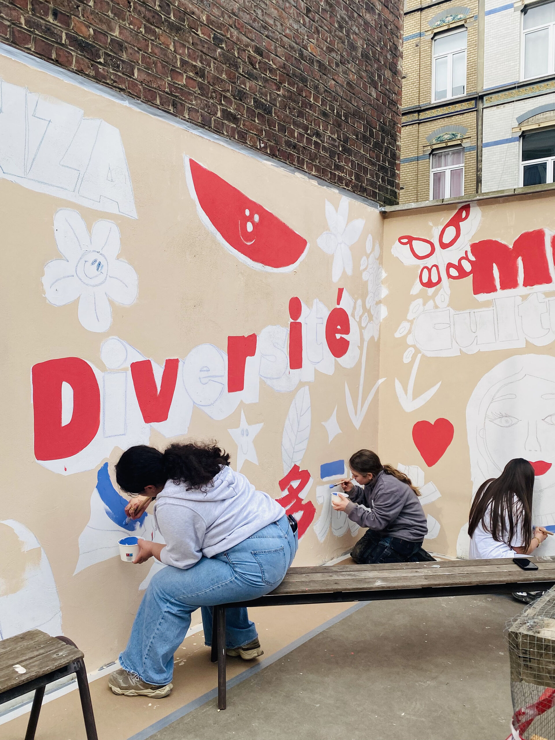 Les étudiant·es, les enseignant·es et l’artiste avaient réfléchi au préalable à ce que pourraient être les thématiques de cette oeuvre collective et préparé des esquisses. Vu la très grande diversité culturelle de l’école, il a été décidé de travailler sur le multiculturel.