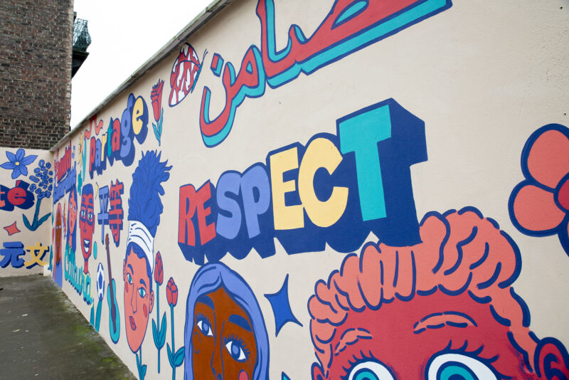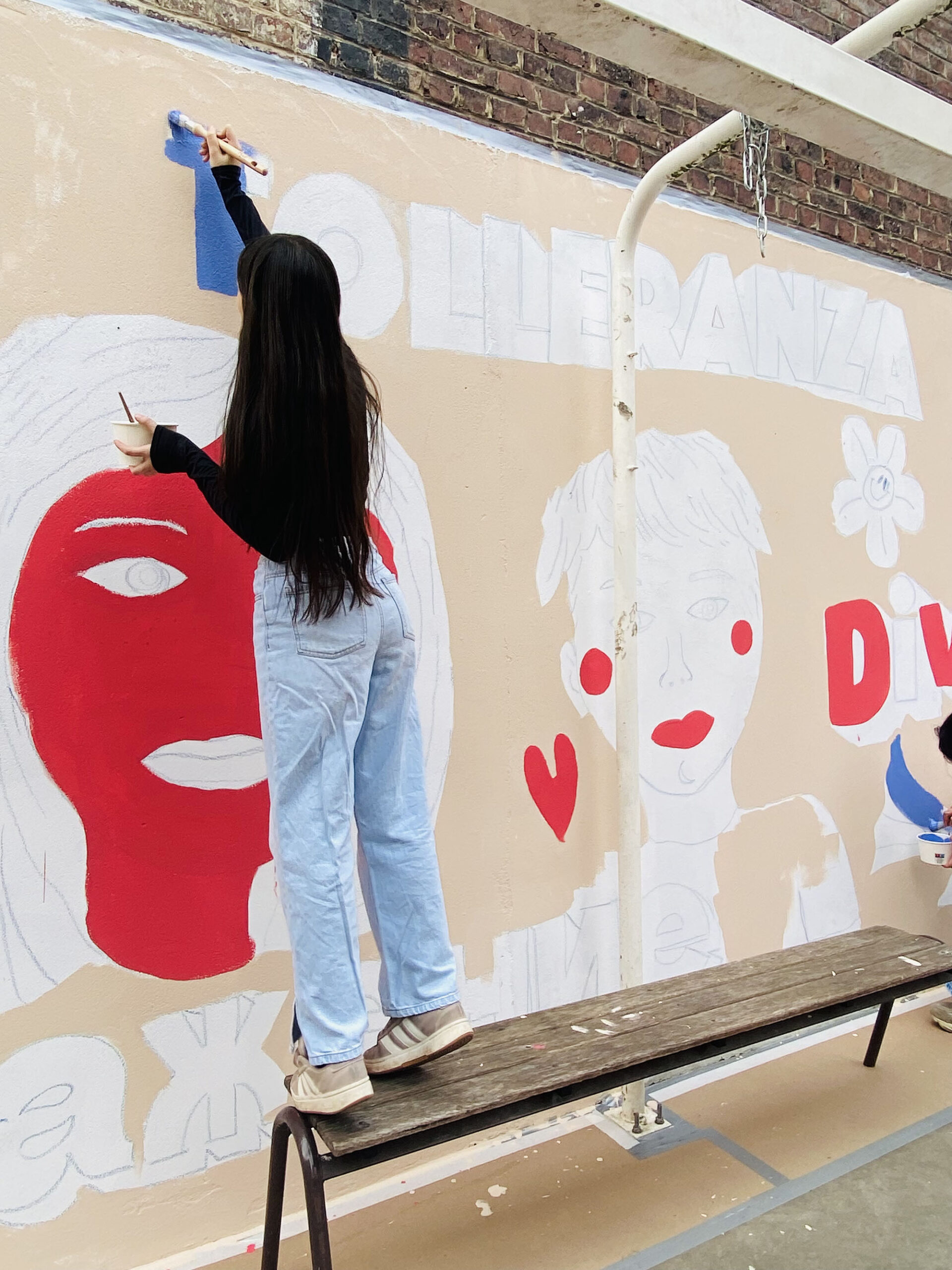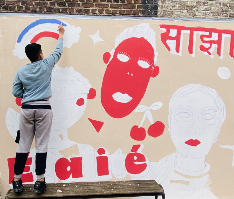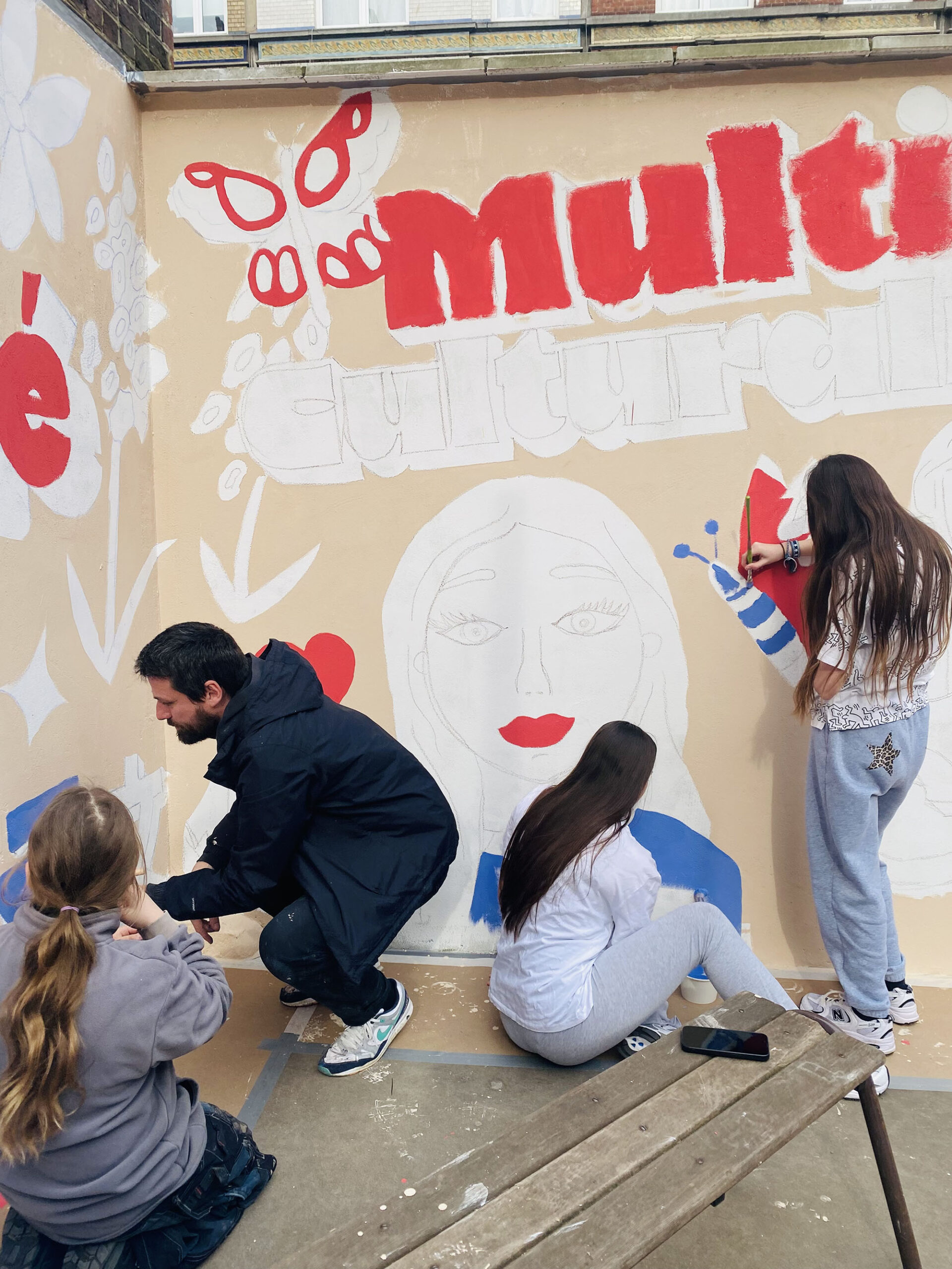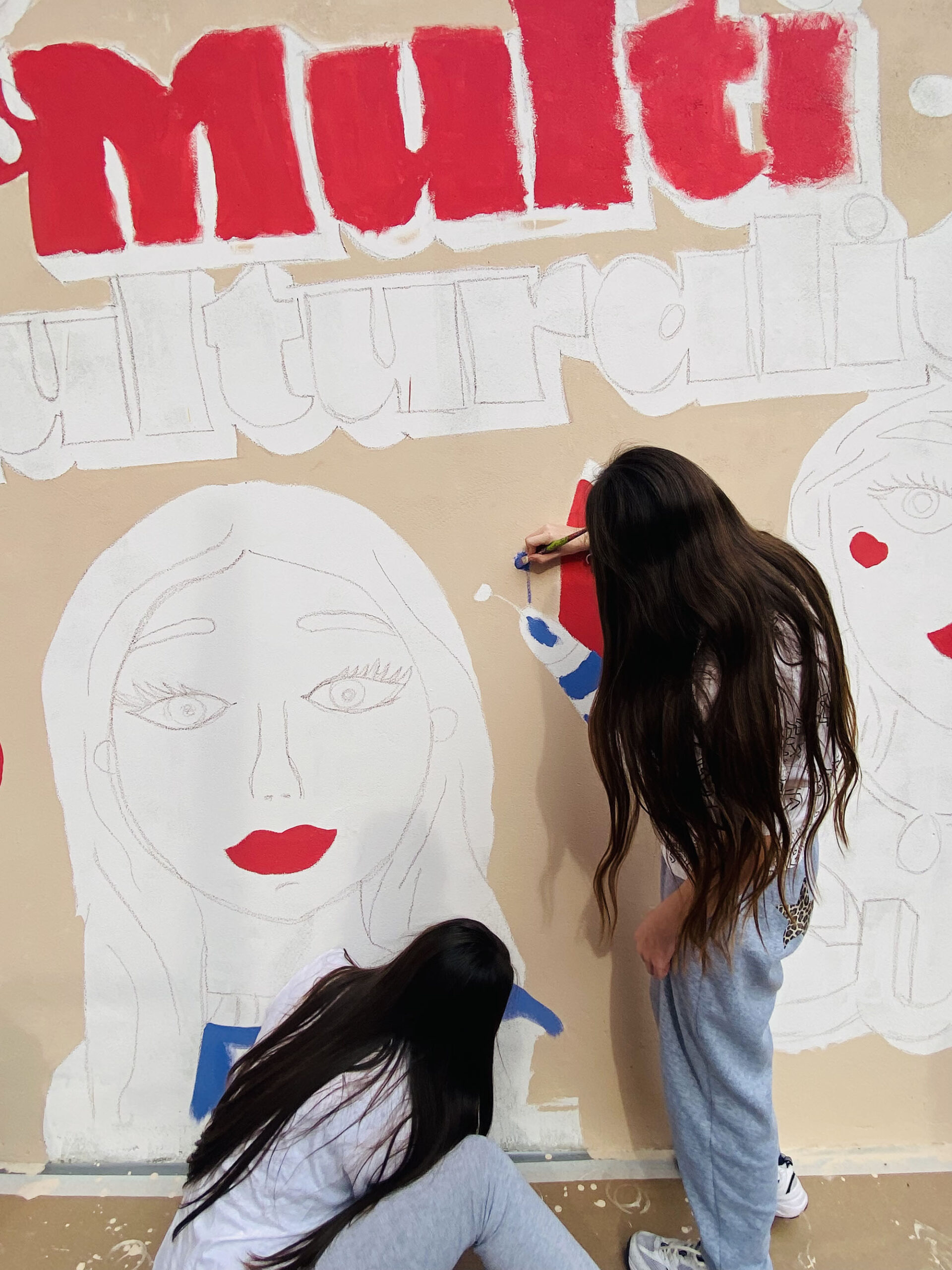 Les étudiant·es, les enseignant·es et l’artiste avaient réfléchi au préalable à ce que pourraient être les thématiques de cette oeuvre collective et préparé des esquisses. Vu la très grande diversité culturelle de l’école, il a été décidé de travailler sur le multiculturel.
