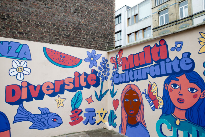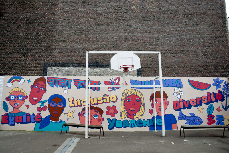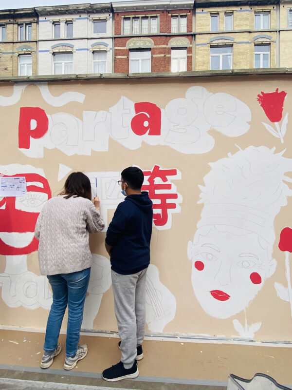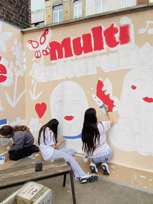 Ainsi, à l’École La Cime (à 2 pas du BRASS, une école secondaire qui fête ses 60 ans 🎉), l’artiste Patrick Croes a réalisé avec les élèves une grande fresque sur les murs de la cour.