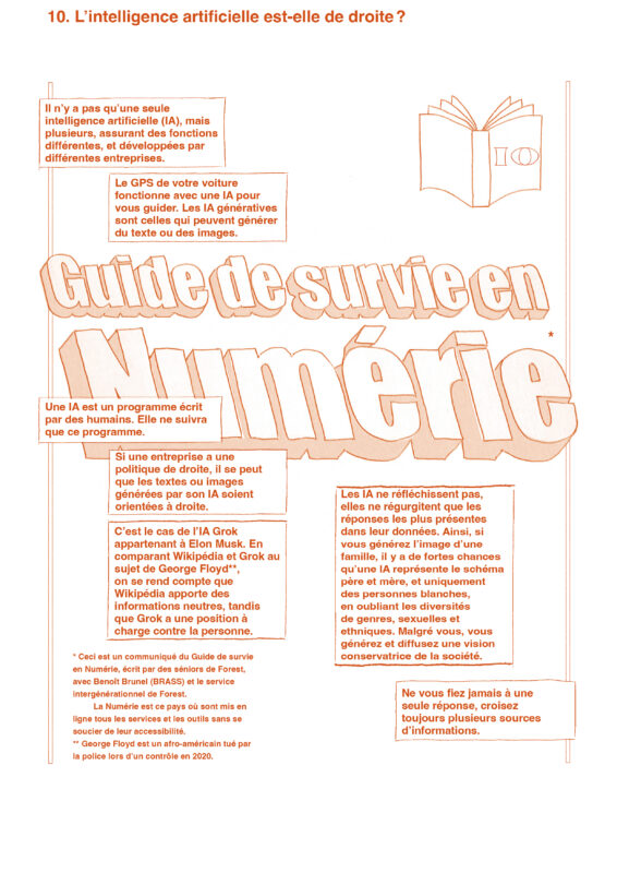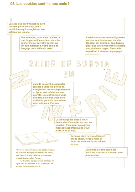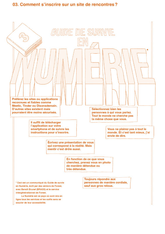 Le guide de survie en Numérie, c’est une sorte de manuel qui tente d’éclairer, par un jeu de questions-réponses, celles et ceux qui se sentent largué·es par l’utilisation d’une boîte mail, par les applications de rencontres, les recherches google, et s’interrogent sur les arnaques en ligne, les cookies, les QR codes etc.