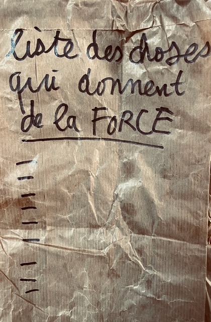 Moi hier j’ai commencé une liste de choses qui me donnent de la force. (J’adore faire des listes.)