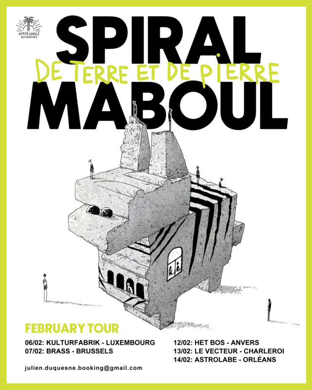 Les huit titres oscillent entre du noise-punk radical, du spoken-word, du gros hip-hop, du métal, des improvisations où des guitares artisanales à une corde rencontrent des raquettes de ping-pong, et puis beaucoup d’autres influences et semblants d’idées lumineuses. Spiral Maboul se découvrira pour la première fois en concert lors de cette tournée en Belgique, en France et au Luxembourg.