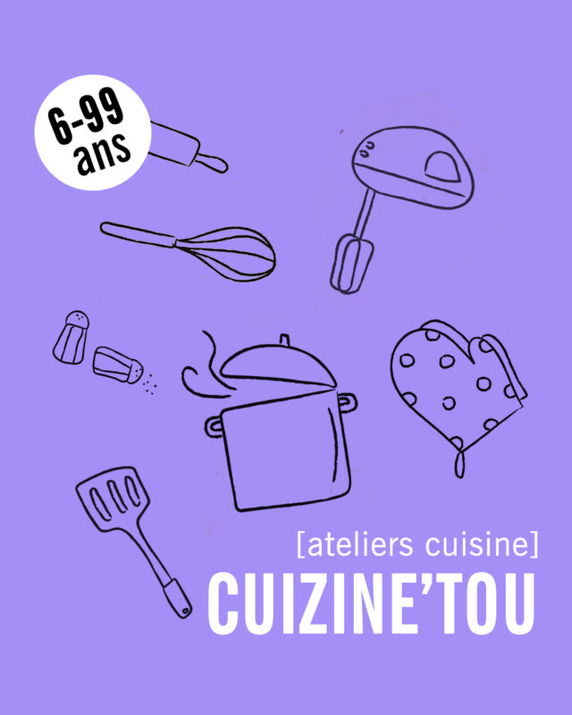 Un samedi par mois, on cuisine ensemble, accompagné.e.s par un.e volontaire, voisin.e, bénévole, artiste qui arrive avec une idée originale, une découverte culinaire, un partage de culture. Une fois que c’est prêt, on déguste ce qu’on a préparé. Enfants à partir de 6 ans très bienvenus (si moins de 12 ans, accompagné.e.s d’un.e adulte :-)